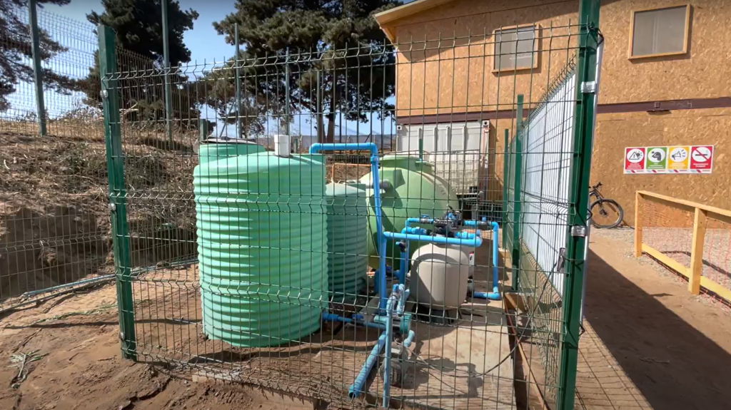Al comenzar el proyecto, vieron que el terreno no contaba con arranque de agua potable. Es por eso que respondiendo a la necesidad de contar con agua se tuvo que implementar un sistema de alcantarillado y que, al partir la resolución desde cero, vieron la oportunidad de implementar el sistema de tratamiento de agua, dejando una línea independiente para las duchas y lavamanos, que va directamente a un estanque para su tratamiento.